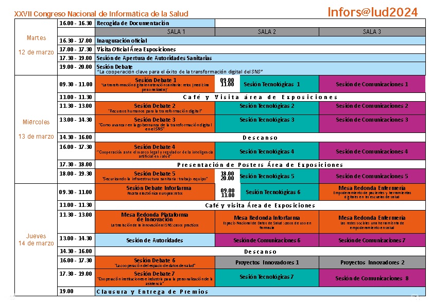 Acorde con estos objetivos sus Comités Organizativo y Científico de Inforsalud 2024 han elaborado un programa que se dirige a facilitar el debate, el intercambio de la experiencia disponible y analizar las oportunidades de avanzar en este tema contando con todos los actores implicados. Para su desarrollo se cuenta con la participación de autoridades sanitarias y de responsables de la digitalización y la innovación al más alto nivel, altos cargos, directivos, y profesionales sanitarios, así como expertos, representantes tecnológicos e investigadores.